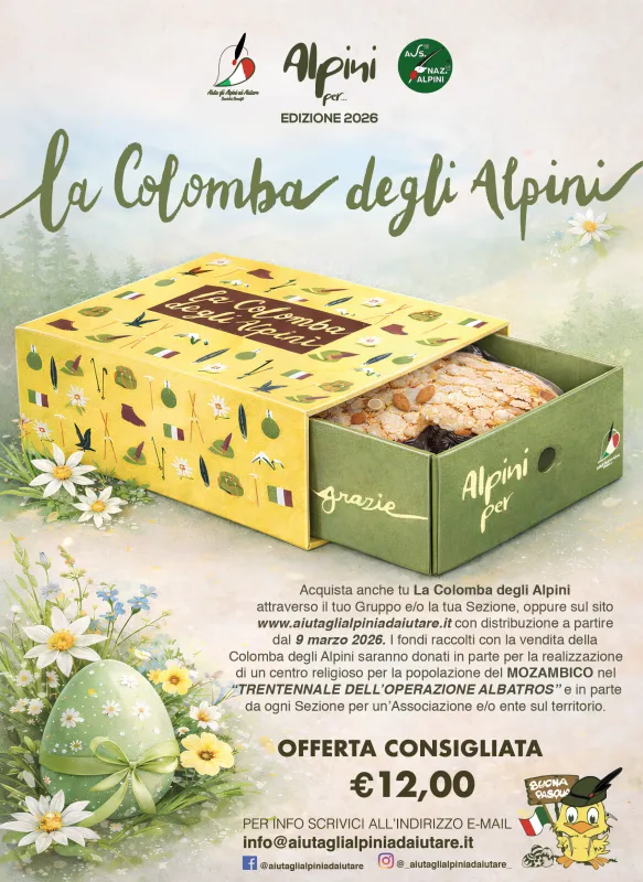 È possibile acquistare la colomba degli alpini rivolgendosi alla propria Sezione o sul sito www.aiutaglialpiniadaiutare.it (12 euro più spese di spedizione). L’evasione degli ordini acquistati sul sito avverrà a partire dal 9 marzo 2026 e seguirà l’ordine di prenotazione.